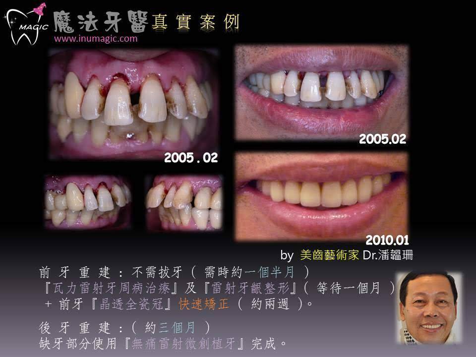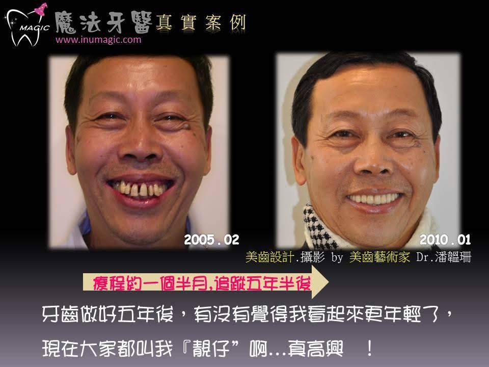 我之前有嚴重的牙周病,澳門兩個醫院都說我前面上下共12顆牙齒都要拔掉,後來我女兒用雷射幫我治療牙周病,之後又作了好看又好用的全瓷牙,只用了一個半月,至今已經8年了,覺得又安慰又高興,更驕傲的是,有那麼厲害的牙醫女兒!因為在澳門每次看牙,那些牙醫都在研究我的牙齒,說我女兒是怎麼做到的!他們都不相信…總之我很開心可以吃很多好吃的美食,人又變得更年輕!